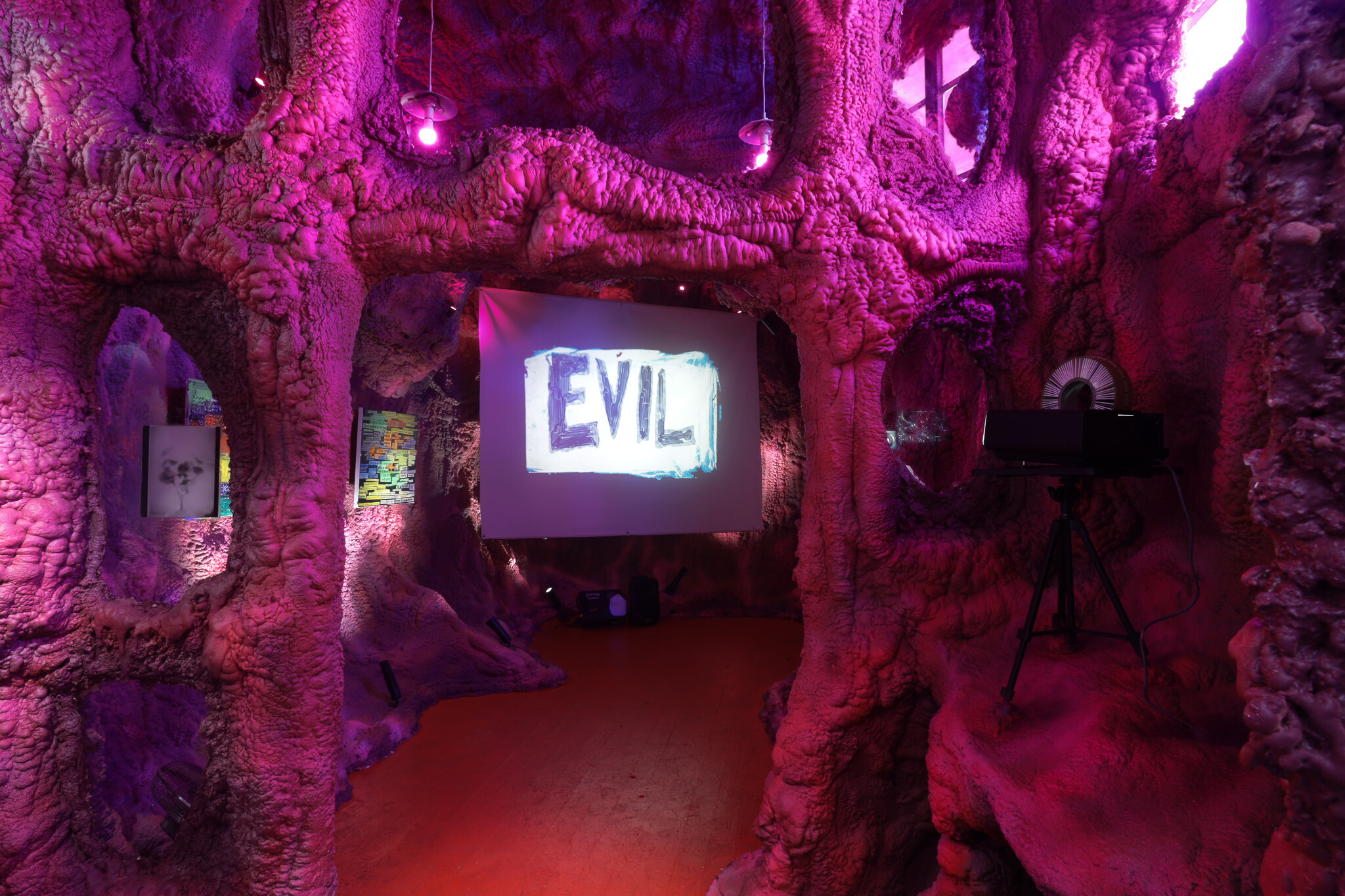 Thank God for Mental Illness is the title of the 1996 Brian Jonestown Massacre album that featured on a skateboard artwork at an early Suicidal Oil Piglet group show. When looking through old shows at this space, many of which Evie was involved in, I can see patterns of archiving fetish commodities. This show seems only to be able to exist in a space such as a womb, a place where love is central. The Womb takes on the trends of surrealist exhibitions and re-imagines them to fit with our highly libidinal economy. Evie contributes to this by reading out loud, “Nothing comes from nothing, simply entertainment, simply existing parasitic relationships.” Like Wading Through Honey marks an important moment in Poggioli’s generation of artists. They’ve found the fetish in the illness, in the parasitic relationships of the artworld and in the internal artworks. Thank God for mental illness, for a time to be perceived. Thank God the patient’s art is spiralling and disorganised; it has resurrected itself as ubiquitous and abstract. No one entrusts us with love’s neurosis quite like Evie Poggioli, who is walking around knee-deep in womby molasses.