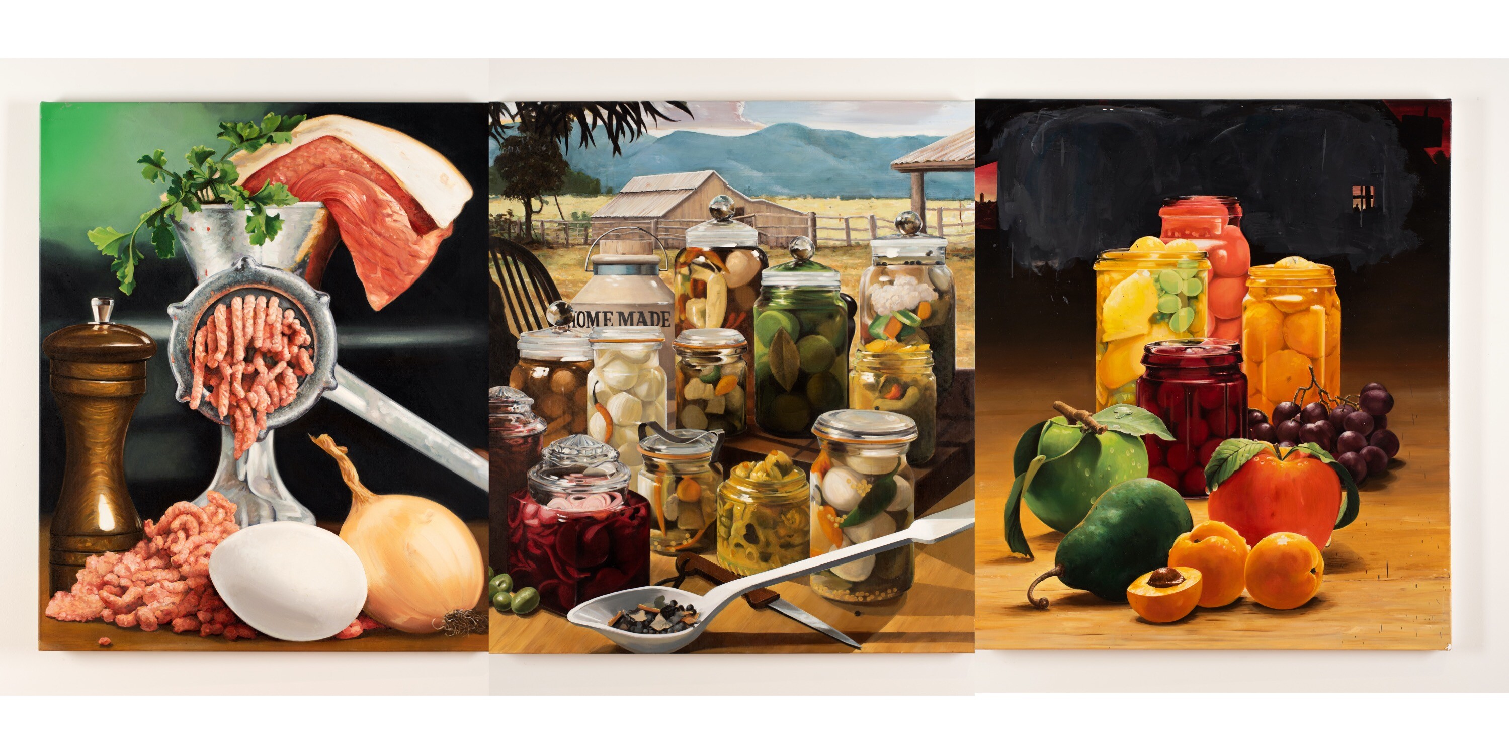 It is interesting in this context, then, that the remaining group of works in the show demonstrates the opposite side of Australian cuisine to this saintly Mediterranean liberation. We have never been a nation known for our great cuisine: despite the best efforts of such luminaries as Margaret Fulton, Charmaine Solomon, and later on Stephanie Alexander, last century in most Anglo-Australian kitchens was one characterised by the long Victorian shadow of Isabella Beeton and the unassailable standard of “meat and three veg.” We have never had an M. F. K. Fisher, an Elizabeth David, even a Julia Child to truly and decisively elevate our palates. In the large-scale paintings on the remaining two walls of the gallery, O’Connor meticulously reproduces cookbook photography of the seventies and eighties. Particularly prescient in my books is Ahhhhh the Good Old Days (for Phil Wymant), a work showing an assemblage of preserves in jars laid out on a farm table in a sickeningly pastoral setting. In The Mushroom Tapes, Helen Garner, Chloe Hooper, and Sarah Krasnostein discuss the prestige factor that remains associated with these Anglo cooking ideals in rural communities (i.e., beef wellington)—a factor intrinsically connected with the persistence of the registers of colonial cuisine. These are the sorts of meals one could imagine the protagonist of Murnane’s The Plains being served up on those anachronistic estates that dot the Western District, transcribed by the photographer Phil Wymant for a national (and nationalist) audience sick with nostalgia for Patterson and Roberts. The other works are no less gaudy in their colours and odd combinations. Preserves (2025) shows another assemblage of jars, topped with a sausage floating in midair and surrounded by an assortment of terribly fecund apricots, apples, and pears. Though the painting is darker than the pastoral scene, there’s a crepuscular shadow in the windows—the tower seen in the background of Aertsen’s Meat Stall. Another work, Cross (2025), sits on the wall with the “Dutch” paintings, but is more at home with these latter pictures. It shows a chi-shaped decussate cross—the same composition as the fish, sausages, and trotters in the Aertsen—made from two ornate skewers, upon which are threaded chunks of tinned peach, sausage, cocktail onions, and spam… Maybe this is the ultimate joy of these paintings, and the photography that they derive from: that they manage to make even the most revolting combinations look incredibly tempting.