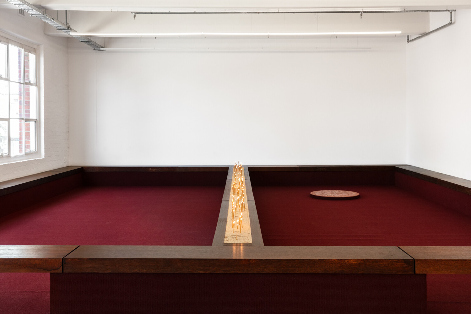 Tina Stefanou, ‘Motet Fail’, 2026, concrete, carpet, wood, stone, granite, sand, beeswax, fire, installation view, West Space. Photography by Janelle Low.