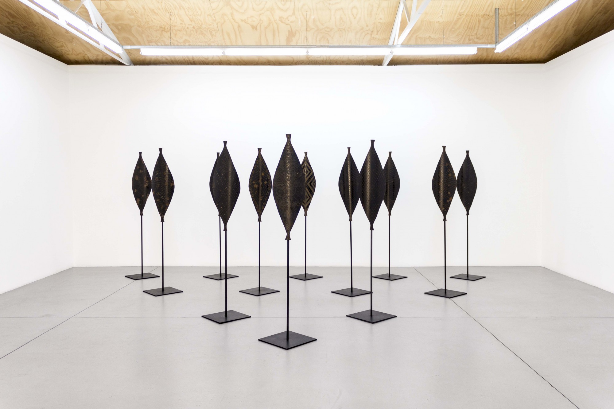 While the exhibition is sparse, the minimalist display of the works allows for in-depth focus on the detail and complexity of each. The sculptural work, an installation comprising of 12 etched steel shields on stands presented in a triangular formation, is captivating and beautifully displayed.