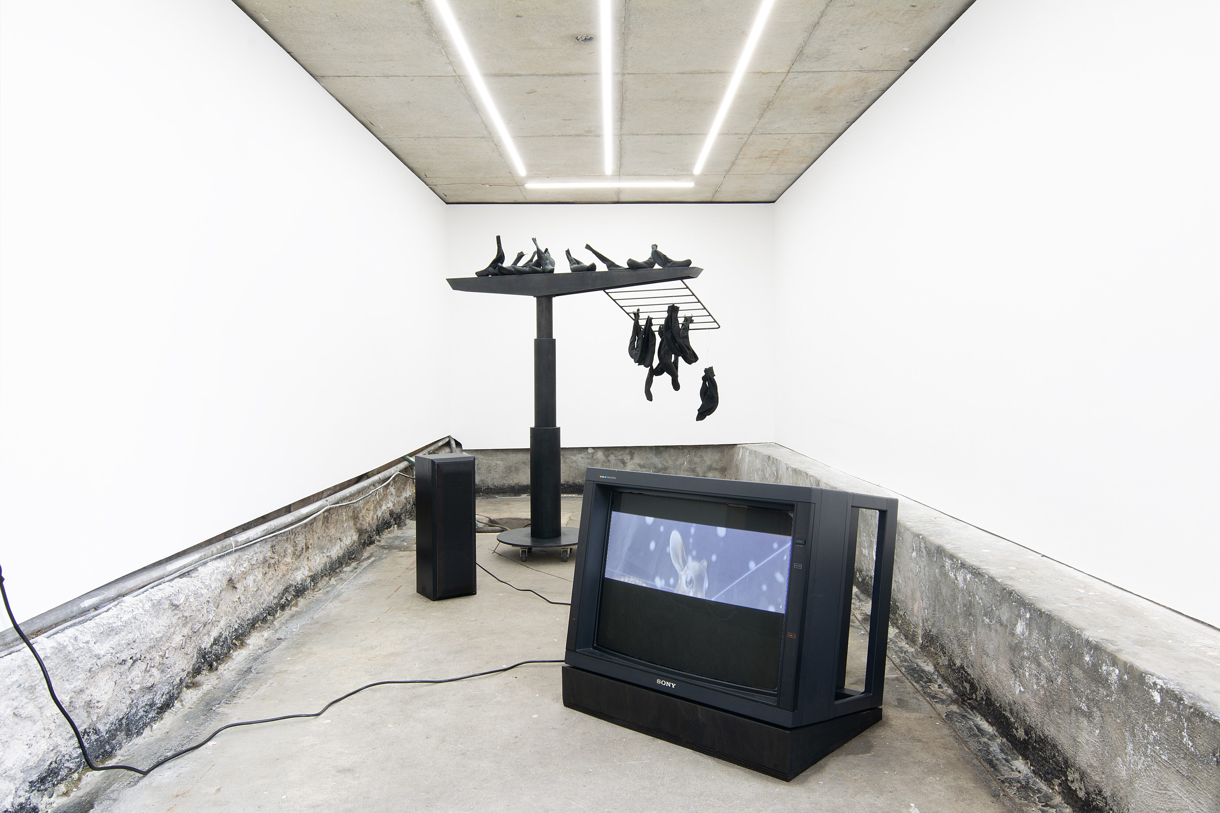 My initial impression is of a jaunty twilight jungle party. These dark objects seem like shadows of something else. The hanging fruit appears like a landscape in the distance, while the television set plays an upbeat track to dance to. It is a parody, I think. Something mocking. Of what? I am not sure. Maybe it is because the Andean jungle is very far away from us, and thereby something we can only understand abstractly, or through premature stereotypes. I am distracted from this train of thought by a friend who has entered, and we get to talking. We take a seat on a ledge within the space, and, after some time, cannot ignore that it is the same song, the same bouncy guitar and pan flute melody playing over again. “It feels sad,” my friend says. We look back over the space, becoming more aware of a scorched atmosphere created by these dark solitary sculptures, intensified by the mockingly contrasted music.