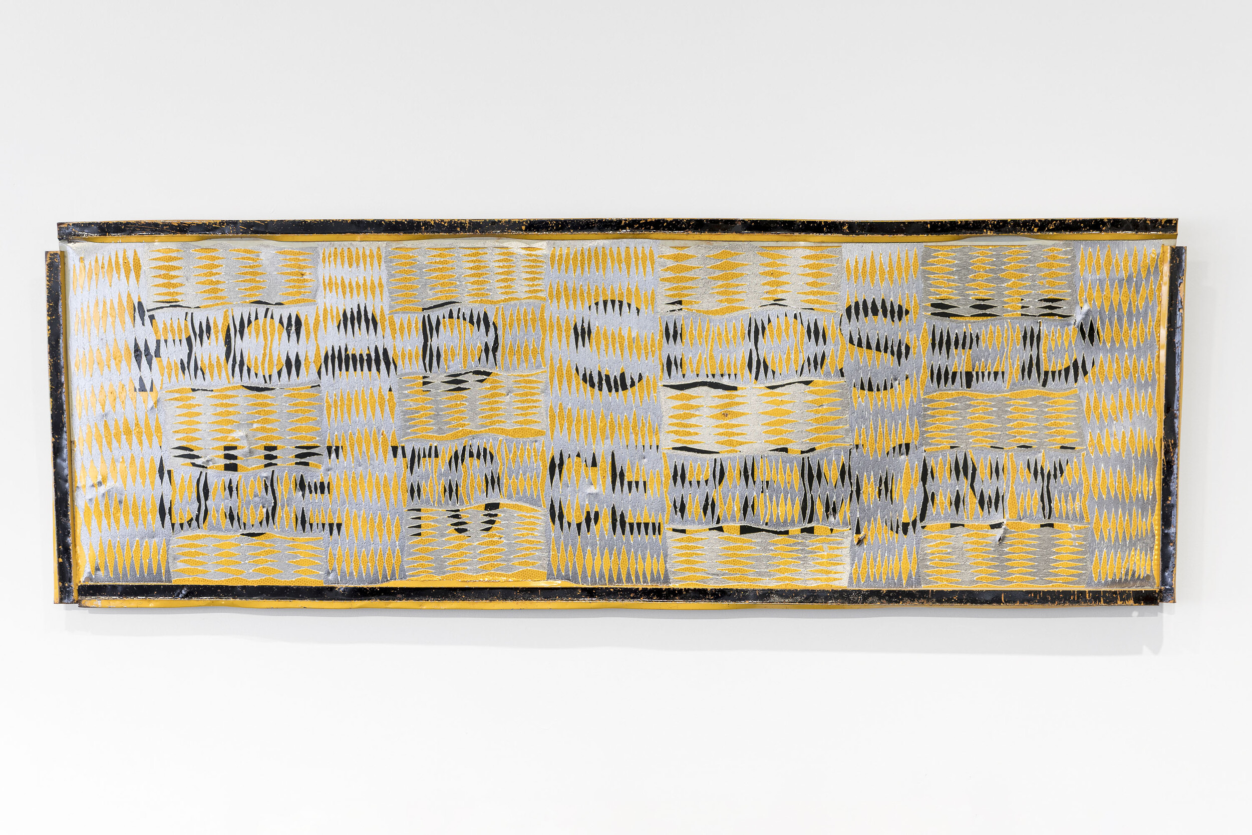 Needless to say, I no longer remember when I first saw one of Yolŋu artist Wanapati Yunupiŋu’s street signs with the words “ROAD CLOSED—DUE TO CEREMONY” on it, but I do remember immediately thinking that it was the most captivating and compelling work of Australian art I had seen since Emily Kngwarreye’s yams. And I do remember thinking of Weber’s essay as a way of reflecting upon it myself. The surface of the metal sign was ground off in a series of crisscrossing, rarrk-like planes with an small rotary grinder to produce a coruscating burnished surface through which the letters appear to be distantly glimpsed. The message of the sign indicates a kind of dead end or injunction not to look at the same time as we cannot take our eyes away. And the fact that the sign had apparently been found after lying dusty and abandoned beside a road around Yirrkala tells us everything about the equally “abandoned” Aboriginal communities in north-east Arnhem Land, colonised and thrown to the side by the gigantic multinational mining companies extracting wealth from Aboriginal land. And, most notably and brilliantly, Yunupiŋu’s art comes out of the very impossibility of continuing that “original” moment of rarrk painting on stringbark gumtrees, as seen in such artists as Mawalan Marika, Galuma Maymuru and Wanapati’s own father, Miṉiyawany Yunupiŋu, in again something of a decline or even end of an Indigenous ritual tradition, perhaps because of the continued pressure on Aboriginal communities if one is an anthropologist, or the running down or exhaustion of that rarrk tradition of painting on bark if one is an art historian. Put simply, the road is closed and the ceremony is not able or permitted to be seen ahead.